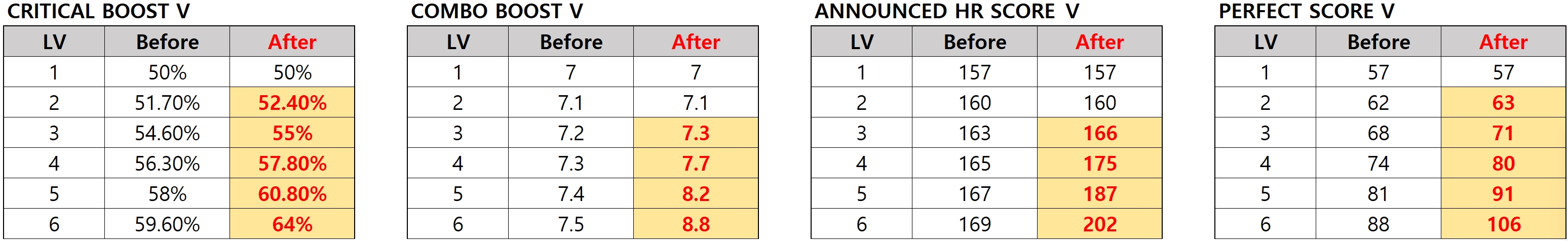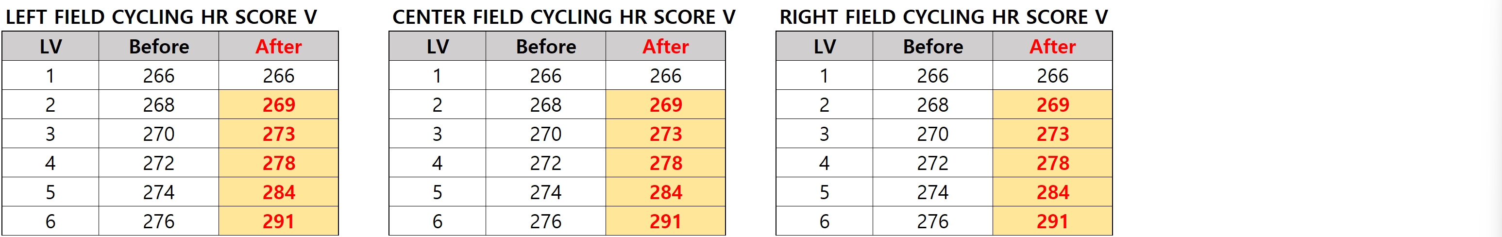 ▶ Game Balance Adjustments: Batters - "Legendary" Grade batters who have reached 2nd Promotion have been adjusted. : Stats are significantly increased when a certain level is reached. 1) Lv. 4 2nd Promotion: Announced Homerun stat increased by 35% 2) Lv. 6 2nd Promotion: Liner stat increased by 300, batter's lowest stat increased by 150