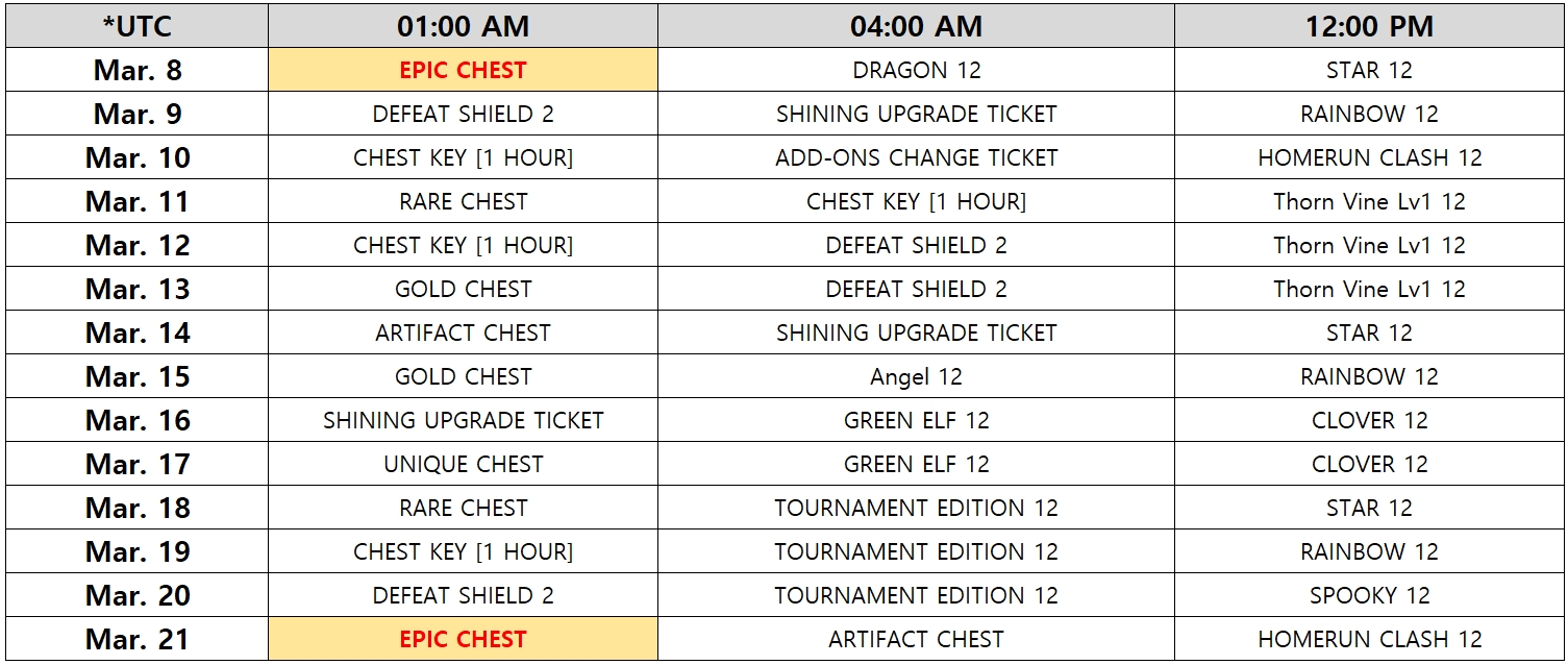 â–¶Entry Fee Betting - Users can bet on the Entry Fee when playing 1vs1, and the match will be carried out in the lesser bet placed by either you or your opponent. (up to x10) - You will earn as much Gold as your bet upon winning. - Event Period: Mar. 8 00:00 (UTC) to Mar. 13 23:59 (UTC) â–¶ Daily Gold Pack Discount - 'Daily Gold Pack' cost significantly reduced, amount of gold significantly increased - Event Period: Mar. 8 2:00 (UTC) to Mar. 14 2:00 (UTC)