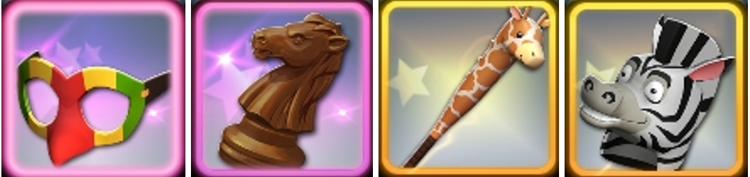 1) GOGLE: PARROT MASK (LEGENDARY) 2) ACCESSORY: Checkmate (LEGENDARY) 3) BAT: GIRAFFE BAT (ALLSTAR) 4) HAIR: ZEBRA (ALLSTAR)
